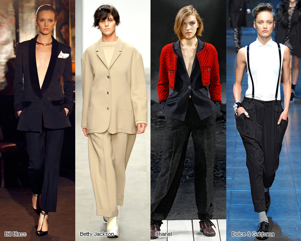 Женщины давно сделали брючный костюм элементом своего гардероба, но в наступившем сезоне им этого показалось мало. Дамы охотно облачаются в классические мужские пиджаки и мешковатые брюки. Нарядный смокинг стал их одеждой на каждый день. Также пришлись по вкусы соответствующие аксессуары: галстук, шляпа и мужские ботинки.